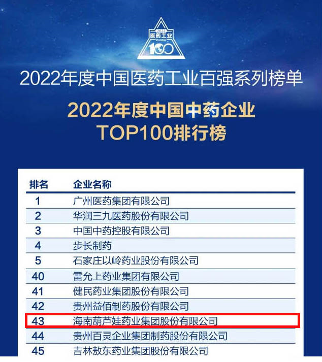 壹号娱乐药业集团连续4年荣登“中国中药企业TOP100排行榜”,排名上升至第43位