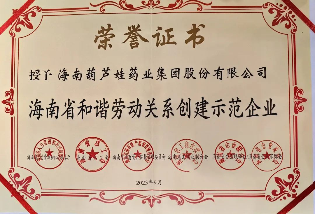 壹号娱乐药业集团获评“海南省和谐劳动关系创建示范企业”